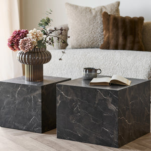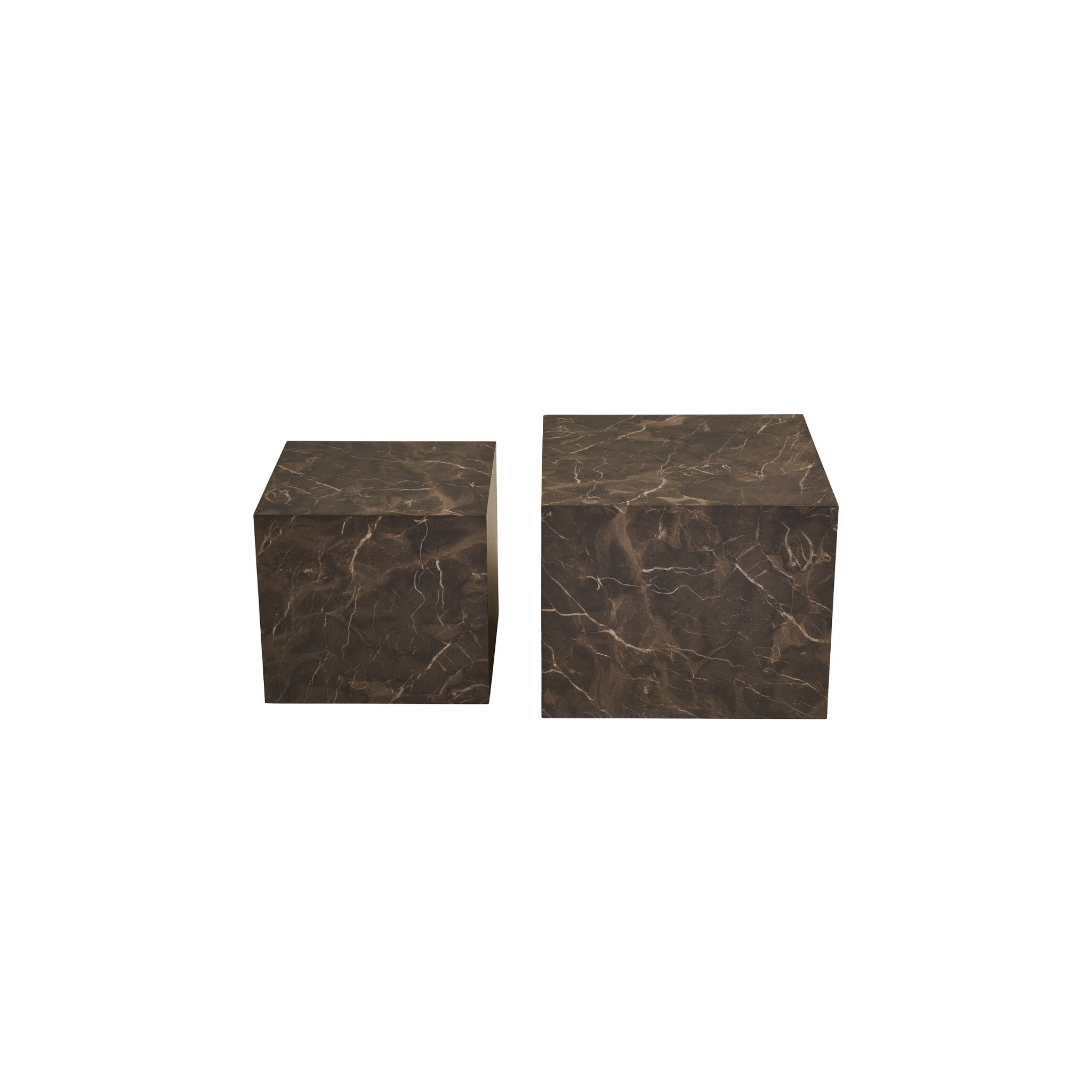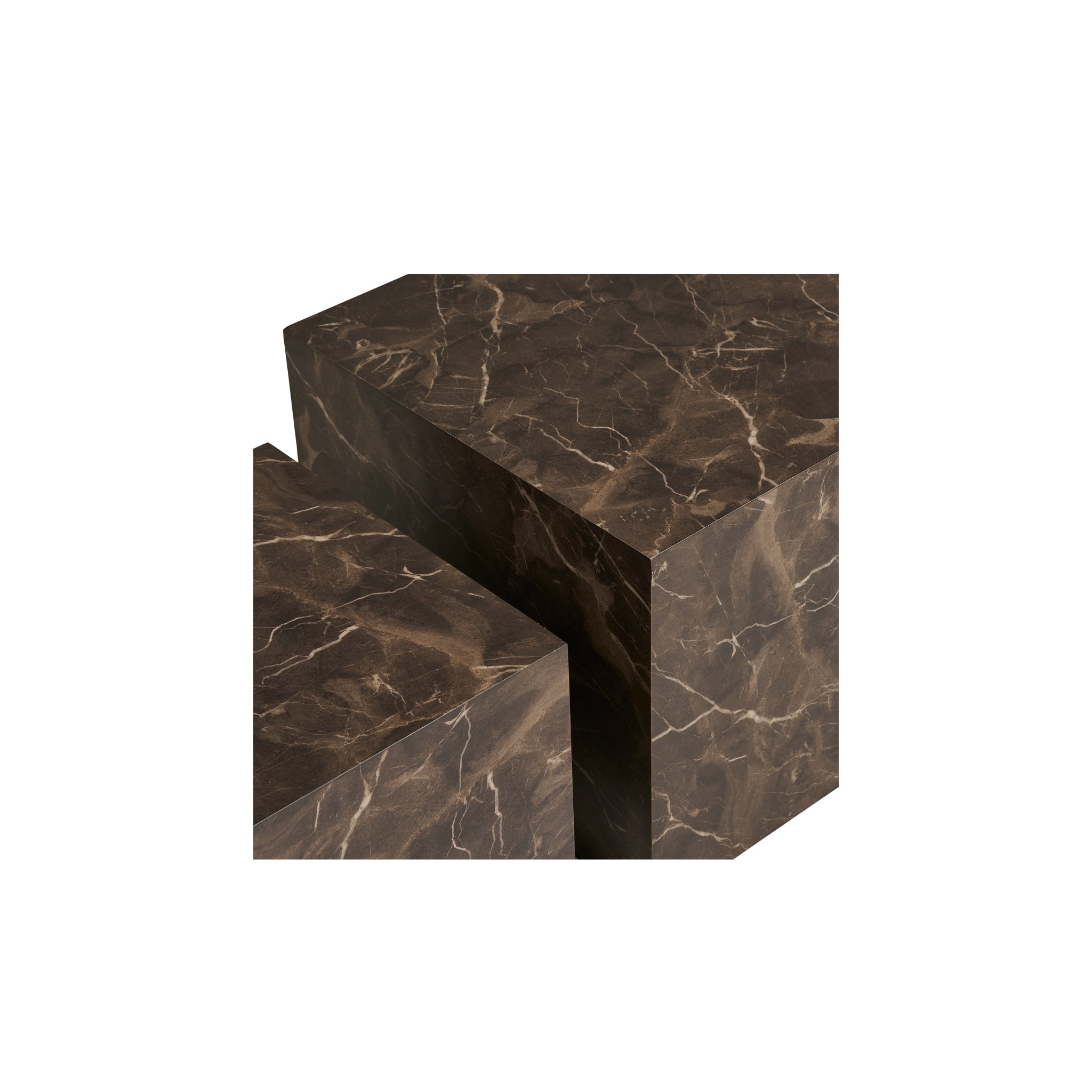 Prague Soffbord är ett stilrent soffbordsset i brun marmorerad design som kombinerar elegans och funktionalitet. Setet består av två fyrkantiga bord i olika storlekar (40×40 cm och 50×50 cm) som kan användas tillsammans i ett modernt set eller separat för att skapa fler ytor i rummet.