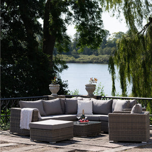 Skapa en elegant och inbjudande loungeyta utomhus med Calvi Lounge Set. Tillverkad i slitstark polyrattan i kubu grey och med en stabil stomme i stål, kombinerar denna modulsoffa stil och hållbarhet. Setet levereras komplett med bekväma dynor i polyester samt ett praktiskt soffbord med härdat glas.