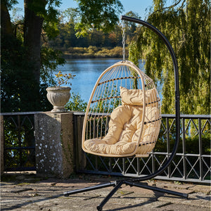 Skapa en mysig och modern loungehörna med Patras Hängstol. Denna eleganta hängstol kombinerar en stabil stålkonstruktion i svart med en vikbar sits i PE-rotting och mjuka dynor i polyester för maximal komfort. Perfekt för avkoppling i trädgården, på balkongen eller i uterummet.