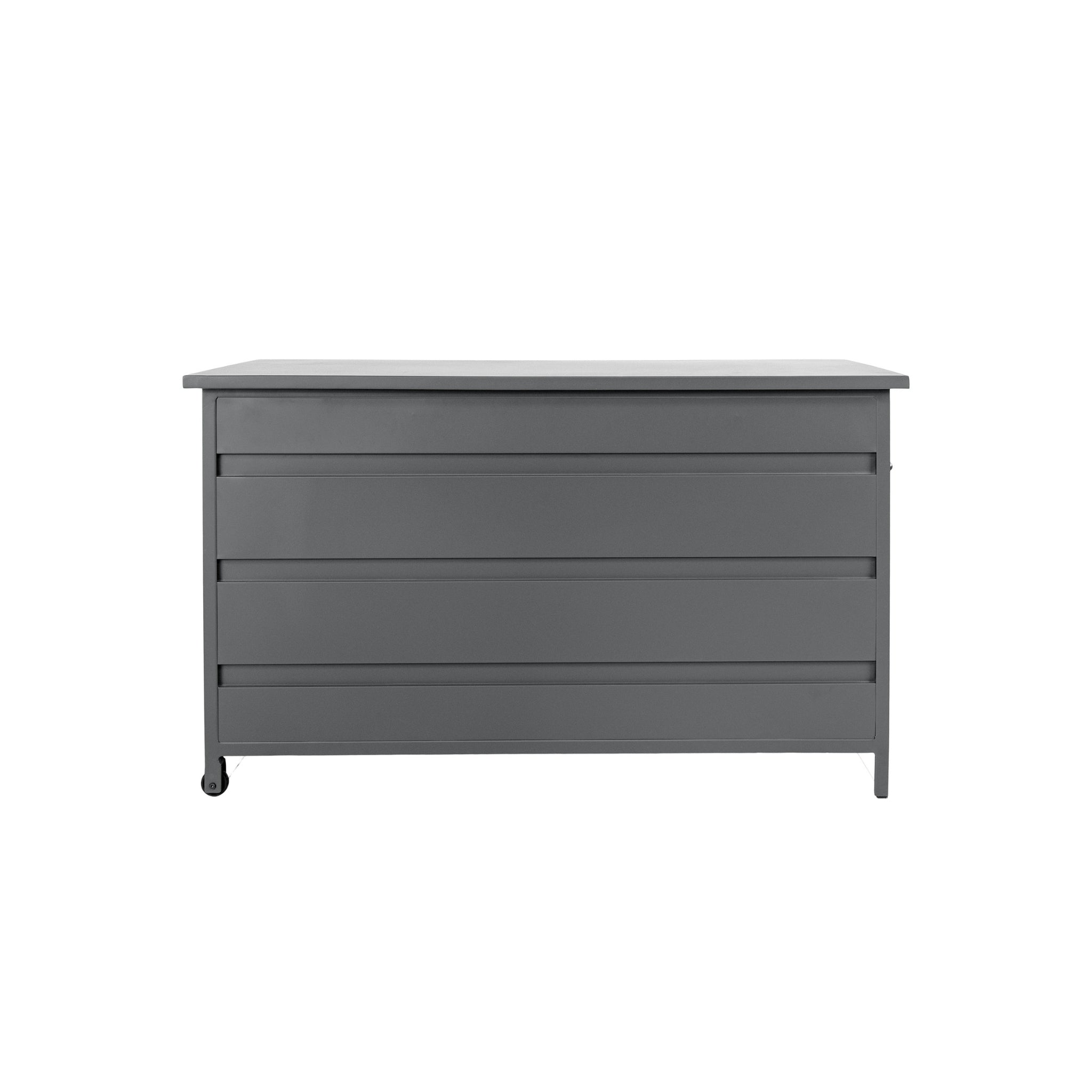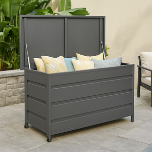 Lådan är dimtät men inte 100 % vattentät. För att säkerställa god ventilation bör den luftas regelbundet om den fylls med kuddar efter dagg eller regn. Den eleganta grå designen passar perfekt på altanen, terrassen eller i trädgården och håller dina dynor skyddade när de inte används.