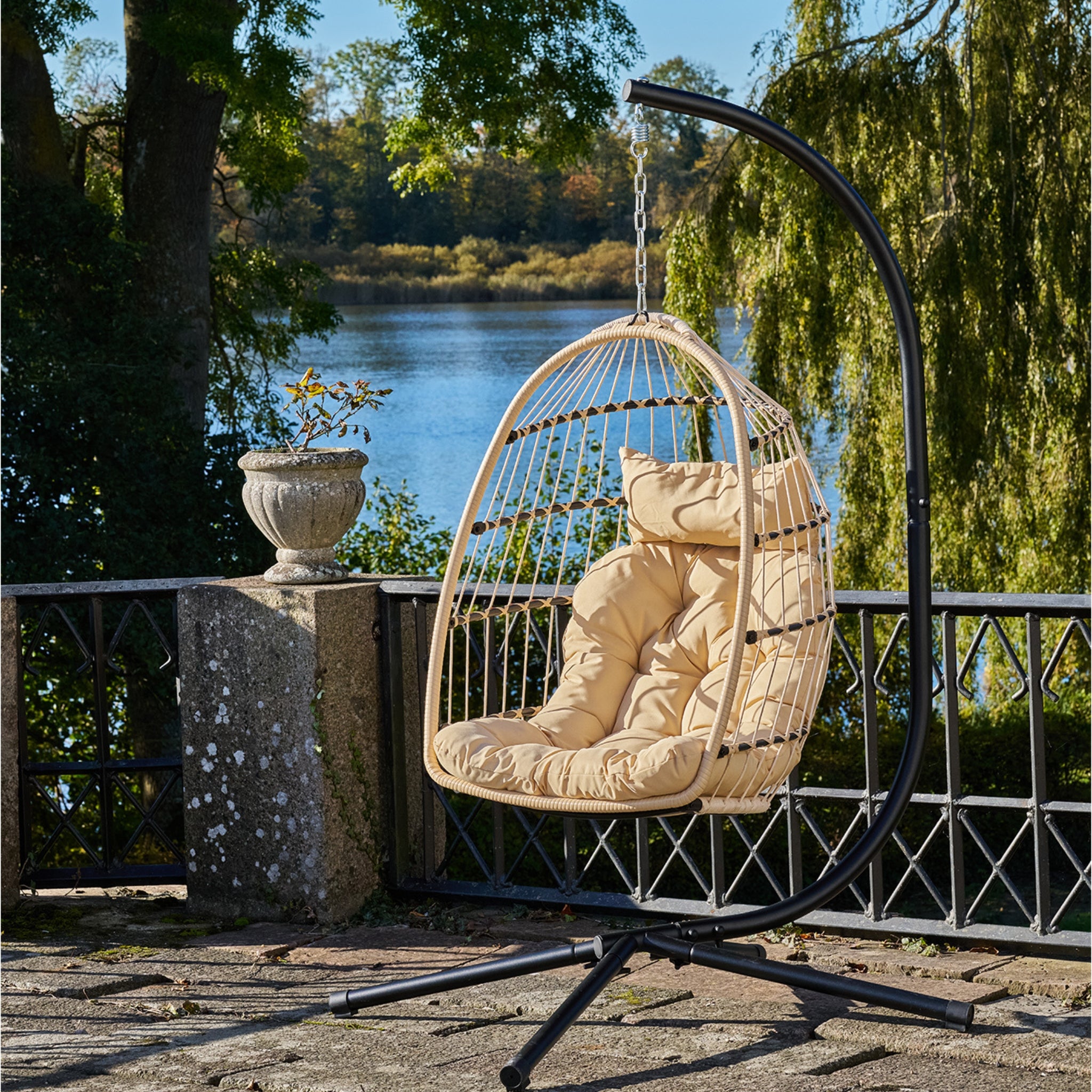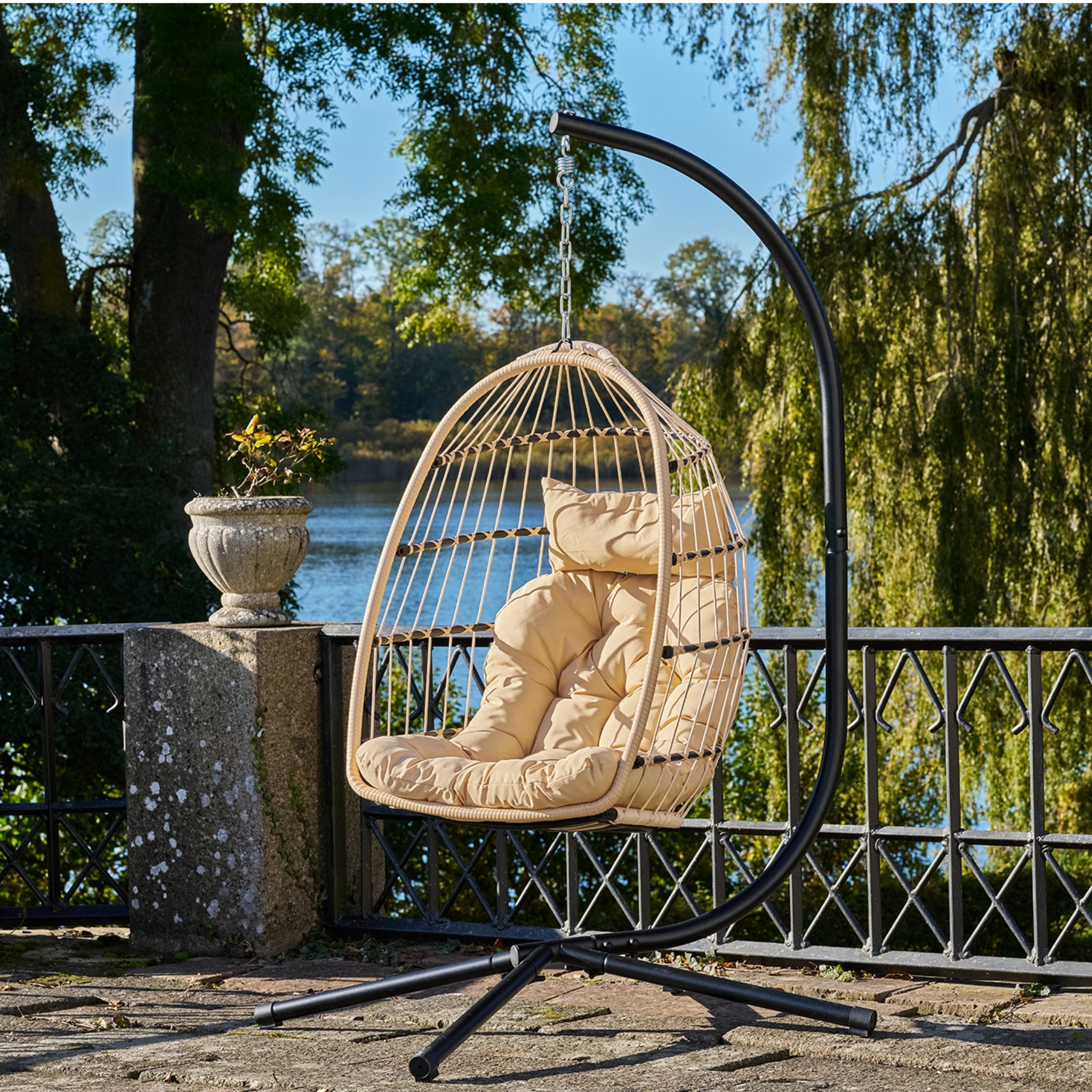 Patras Hanging Chair levereras i knocked down-utförande för enkel transport och smidig montering.